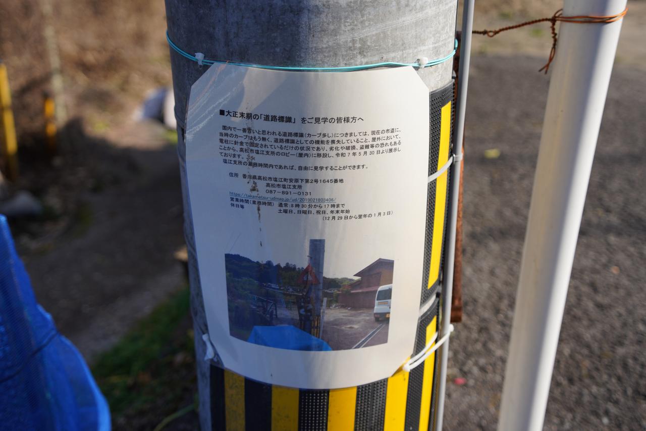 塩江でもう一つ見に来たかったのが、大正時代の道路標識。旧国道193号線に設置されていて、全国でもここだけとも言われていた標識です。