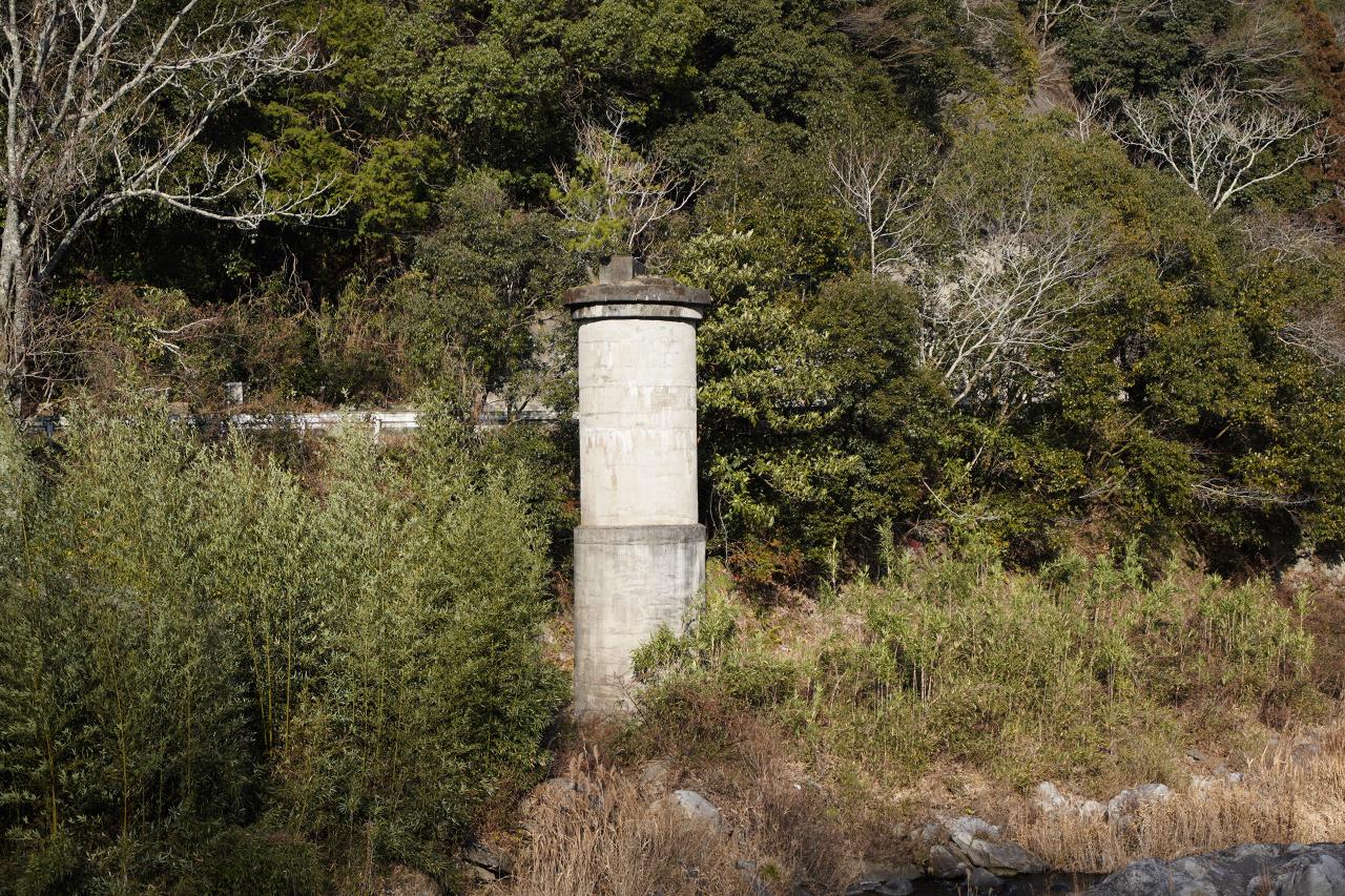 トンネルを越えて「新中村大橋」から見える円柱型の2本の柱。線路などは全て撤去されてしまっていますが、この柱だけは当時のまま残されています。90年以上前に建築されたコンクリートが今でも崩れずに残っているのがすごい。