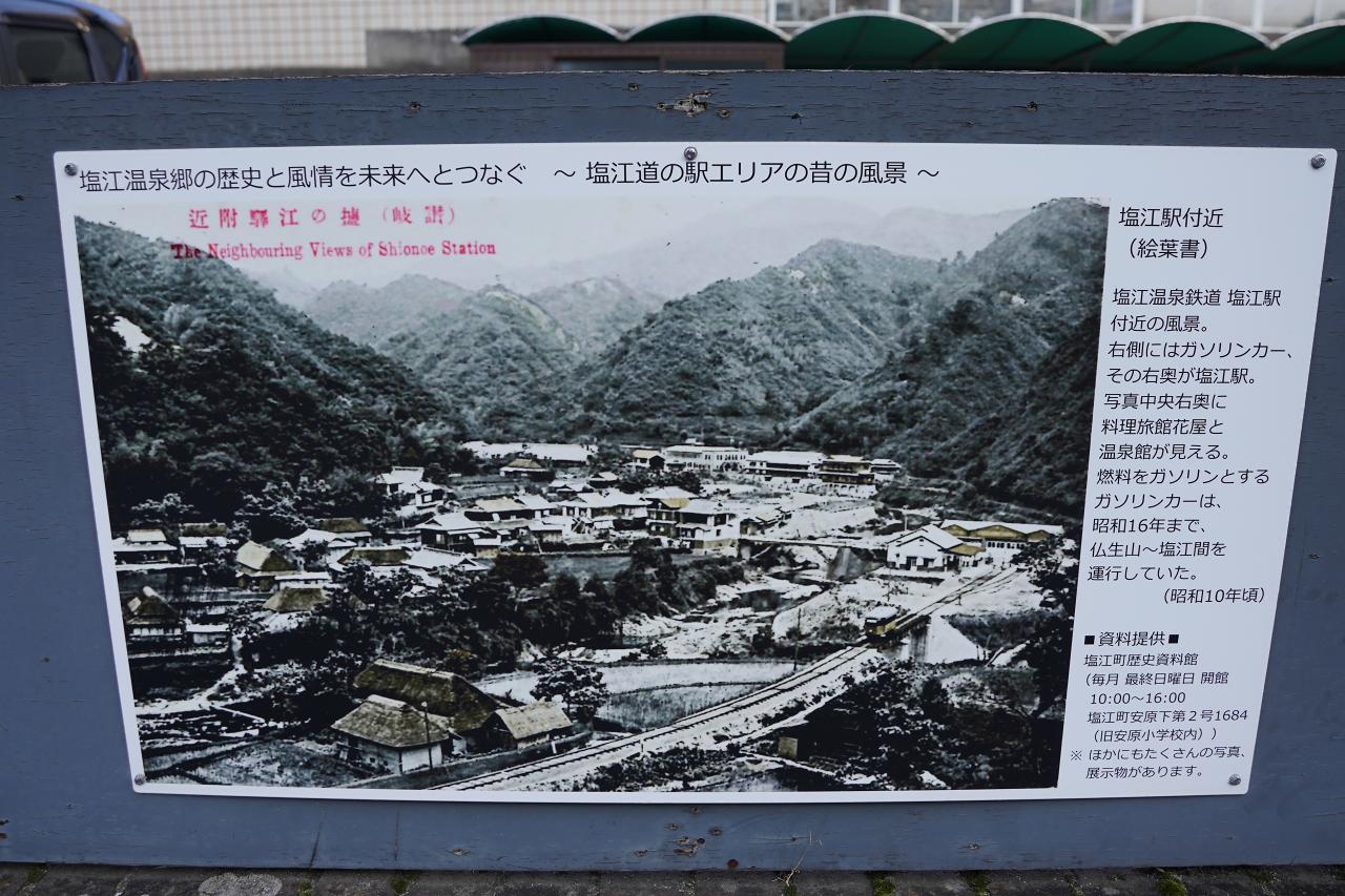 道の駅の向かい側には塩江温泉鉄道の写真が展示されています。ここは塩江駅と塩江温泉を撮影した写真のようで、温泉街として賑わっていたようすが記録されていました。