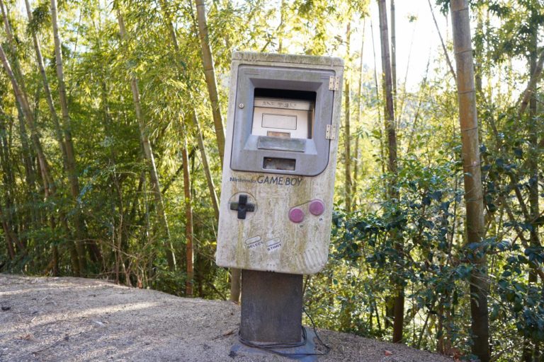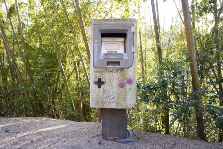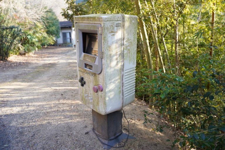 突然ポツンと現れるポスト。本当にゲームボーイの形してる……! これはビックゲームボーイと呼ばれる任天堂公式の商品だったようで、本来は屋内に設置されるものなんだとか。