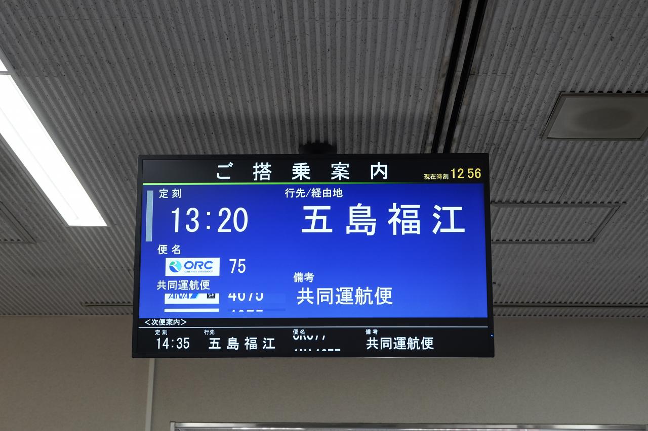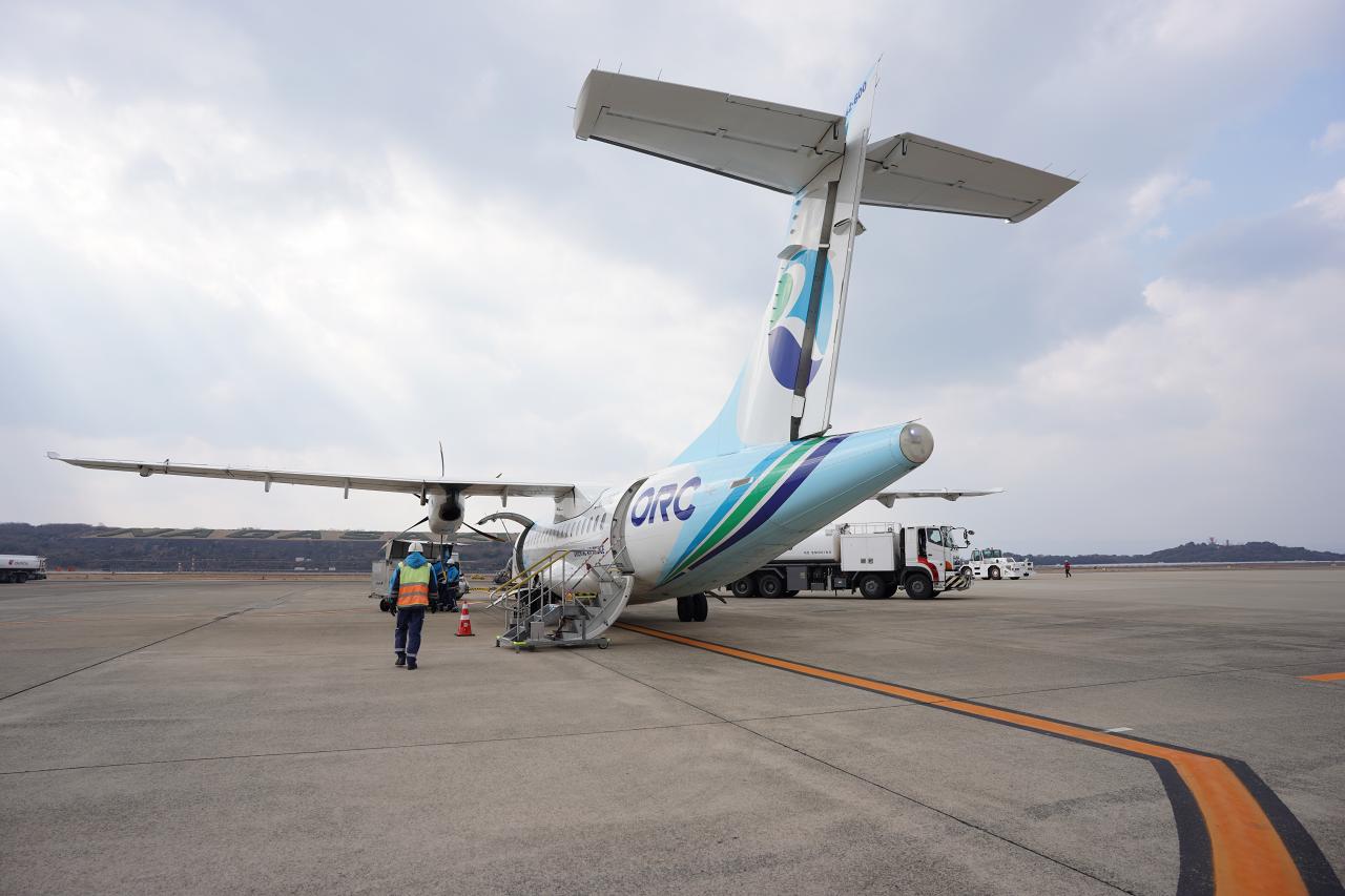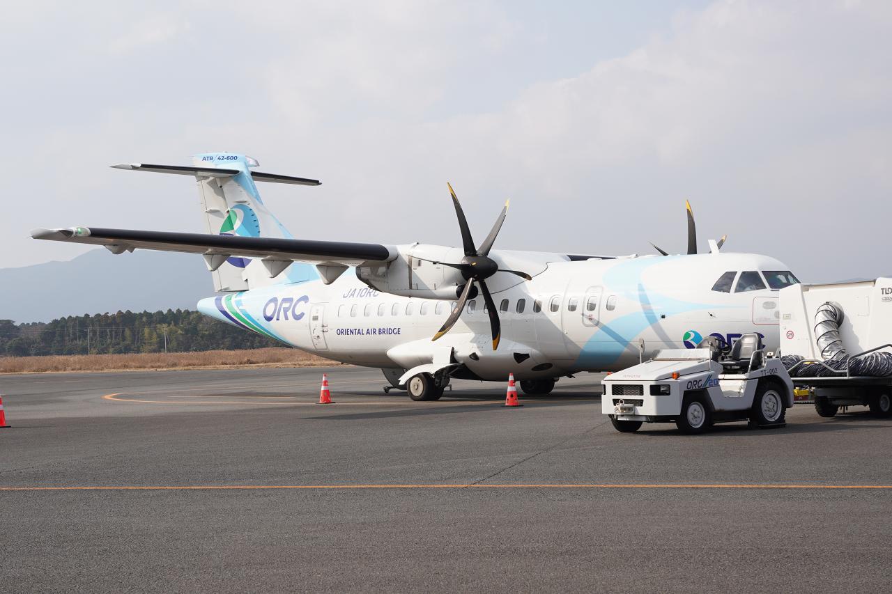 搭乗30分前になったのでラウンジを出て搭乗口へ。乗るのはオリエンタルエアブリッジ(ORC)の飛行機で、福岡・長崎からの離島便のほか、福岡⇔宮崎便なども運行している航空会社です。