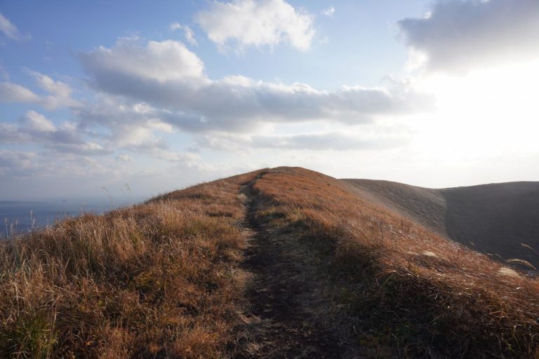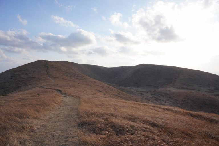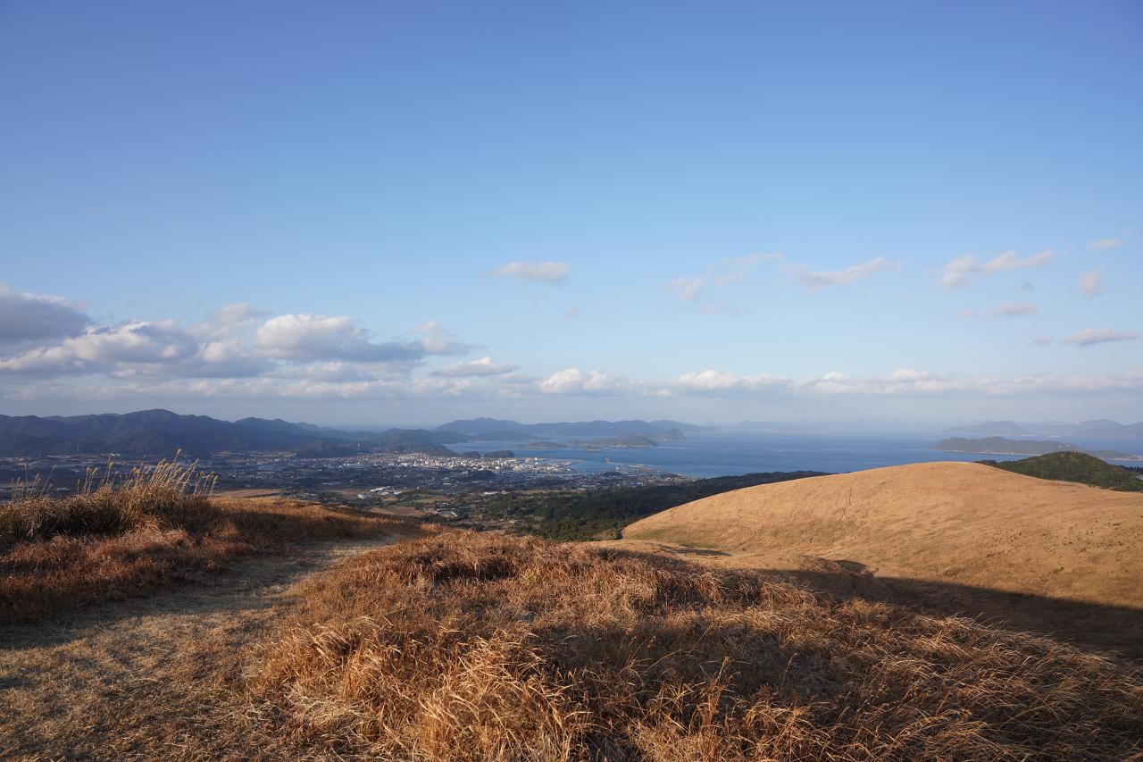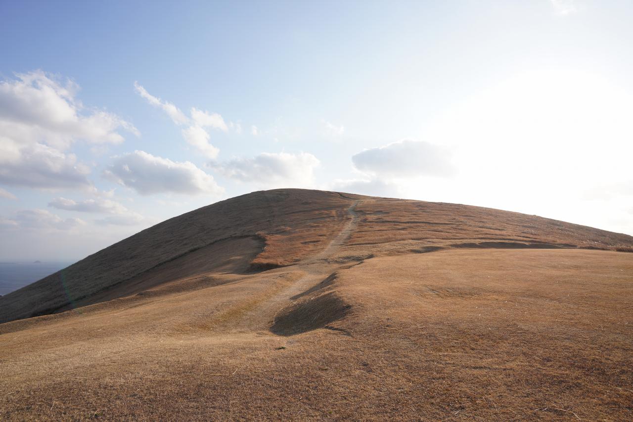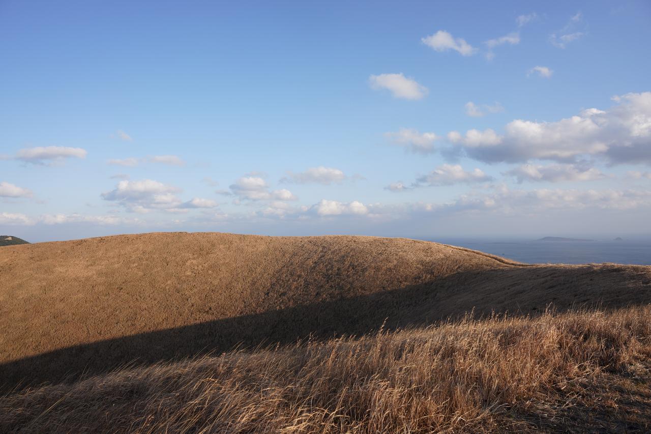 そして山側を見ると、とても広い高原のような雰囲気。時期によっては美しい緑の絨毯のような光景にもなるみたいだけど、今の時期は枯草の色。これもこれで良いけどね。