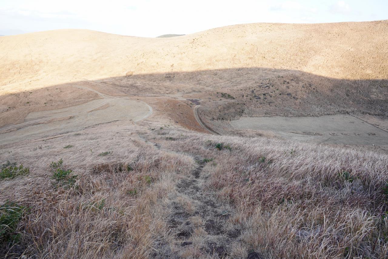 振り返って歩いてきた道を見てみると、やっぱり山よりも高原って感じにしか見えない。大きなソリとかで滑り降りたくなるような斜面だけど、絶対大事故になりそう。