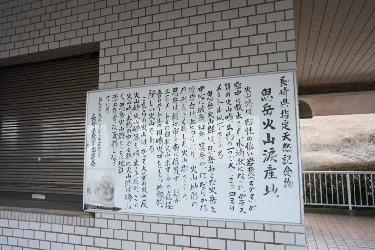 展望台から降りて管理事務所のような建物に行くと、昭和29年と書かれた案内看板がありました。文言自体は昭和29年かもしれないけど、これ自体はもっと新しそう。マグマが固まってできる「火山涙」の紹介文のようです。