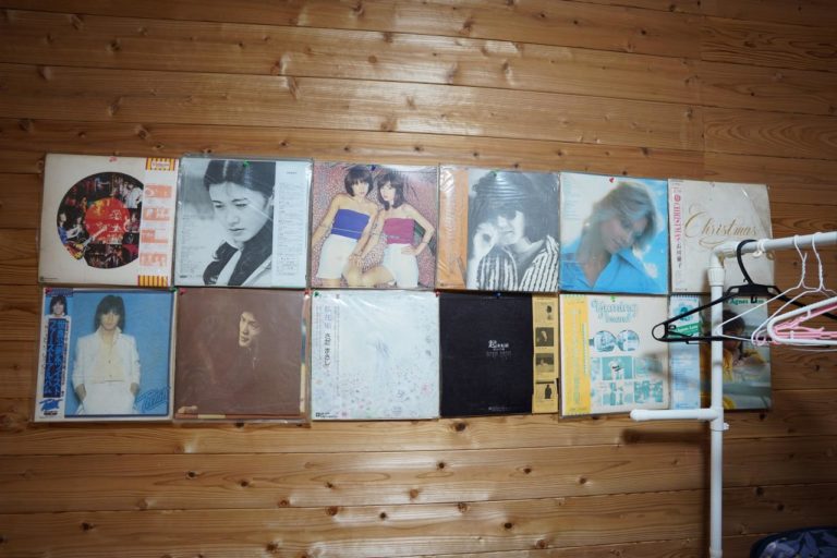部屋の壁には懐かしのレコードが飾られています。アーティスト自体は知っているけど、曲を知らないのが多い。この世代の人とかって一部の曲しか知らないからなぁ。