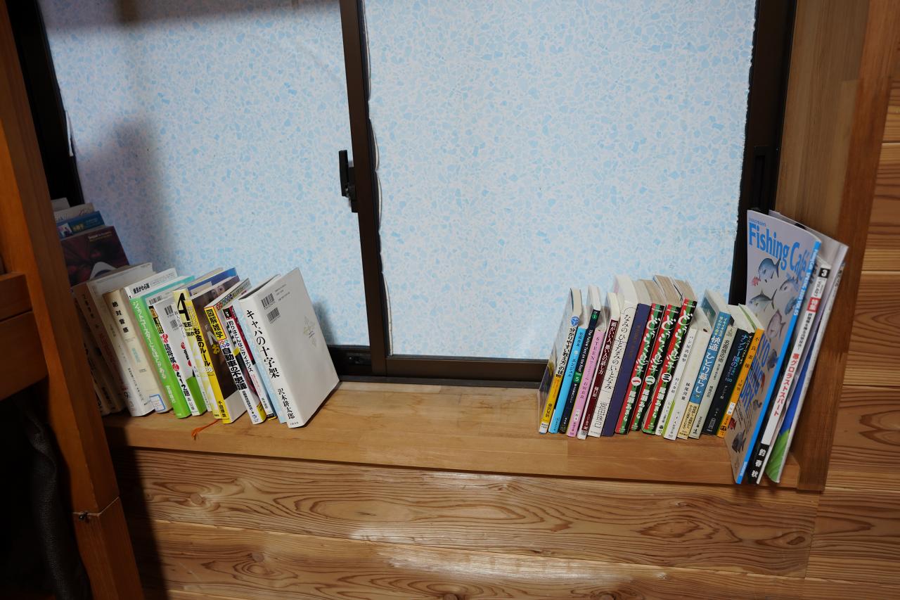 窓側には本があれこれ。釣り関連の雑誌も置いてありました。