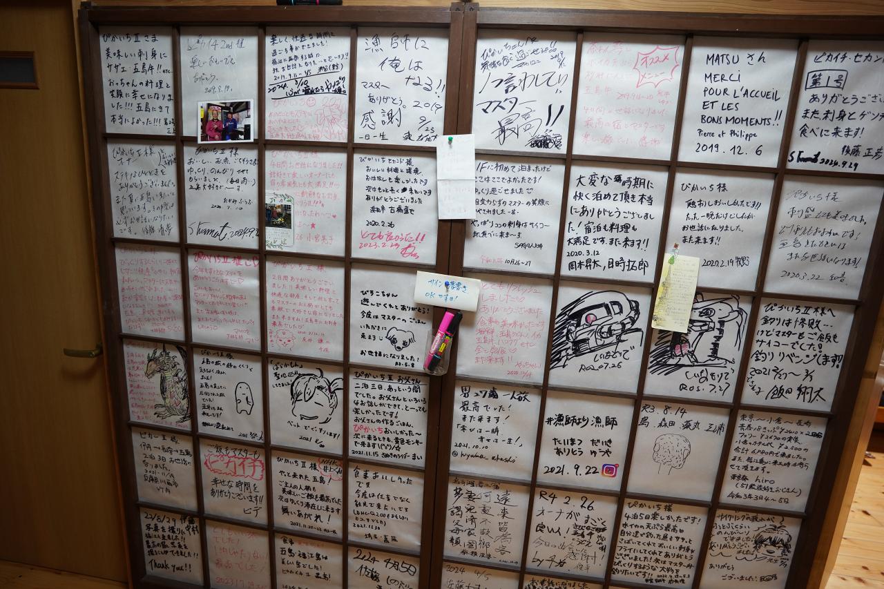 洗面台の裏には宿泊した人たちの旅ノートのようになっている障子がありました。もう書くスペースがないけど……。