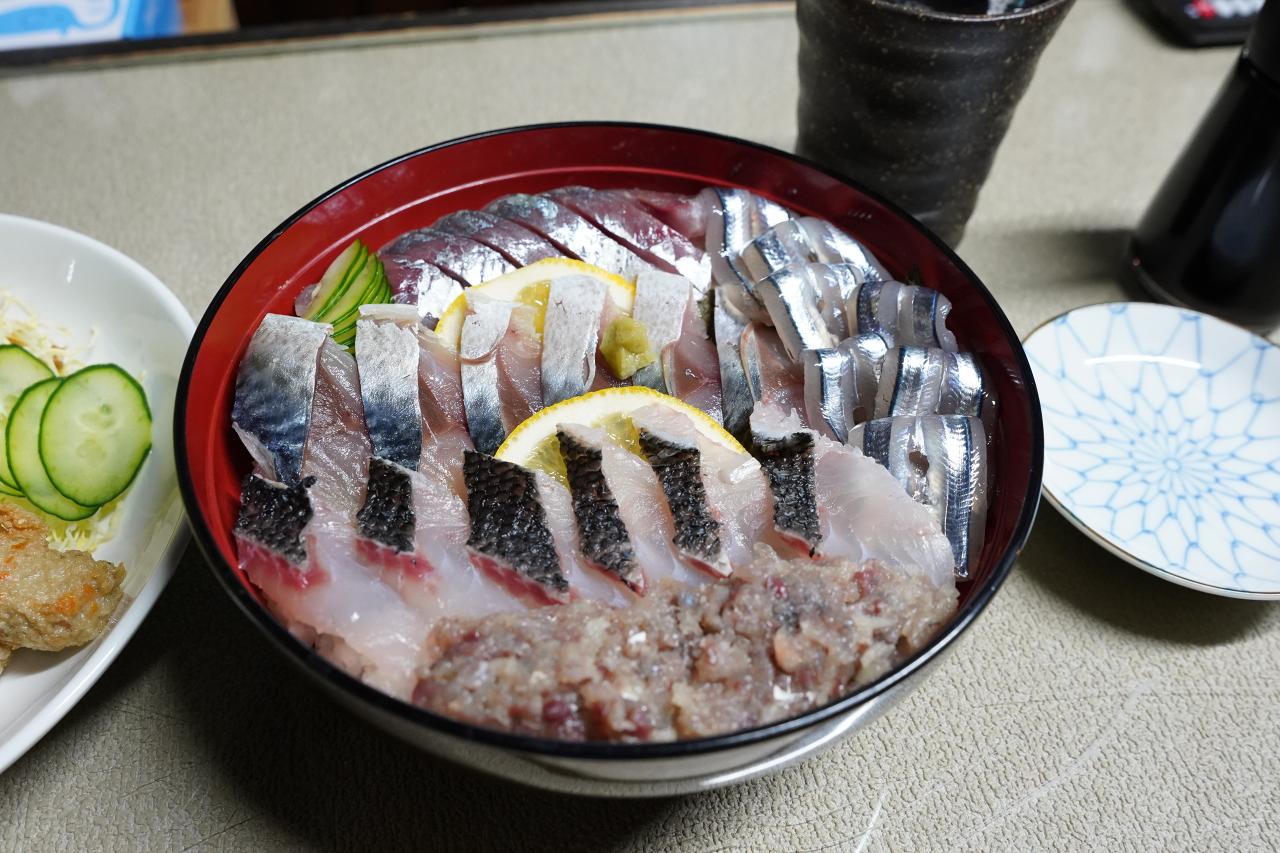 海鮮丼はアジやサバ、きびなごなど五島の海の幸を盛り合わせた一品で、ごはんが見えないほどに刺身が敷き詰められていて豪華絢爛。食べても食べてもなかなか刺身が無くならないって幸せ……!
