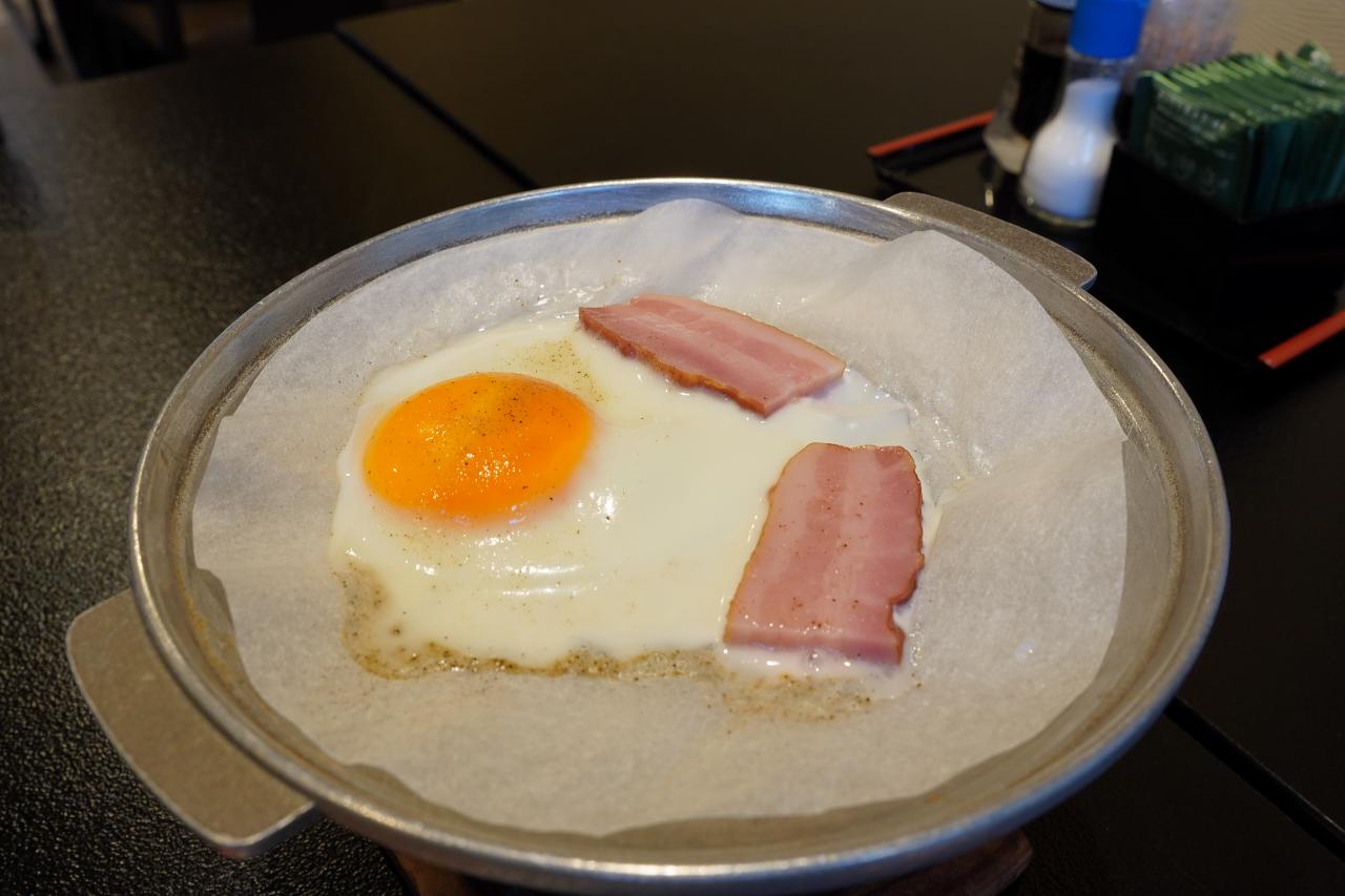 ジュージュー焼かれていたのは目玉焼きとベーコン。半熟くらいに焼けていておいしそう。トロッとした卵をご飯に絡めるのが好き。大満足な朝食でした。ごちそうさまです。