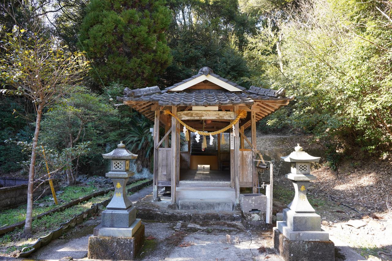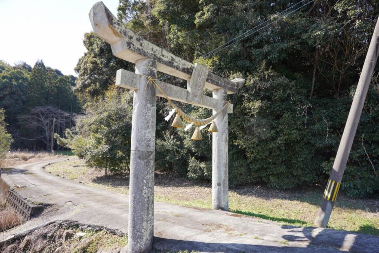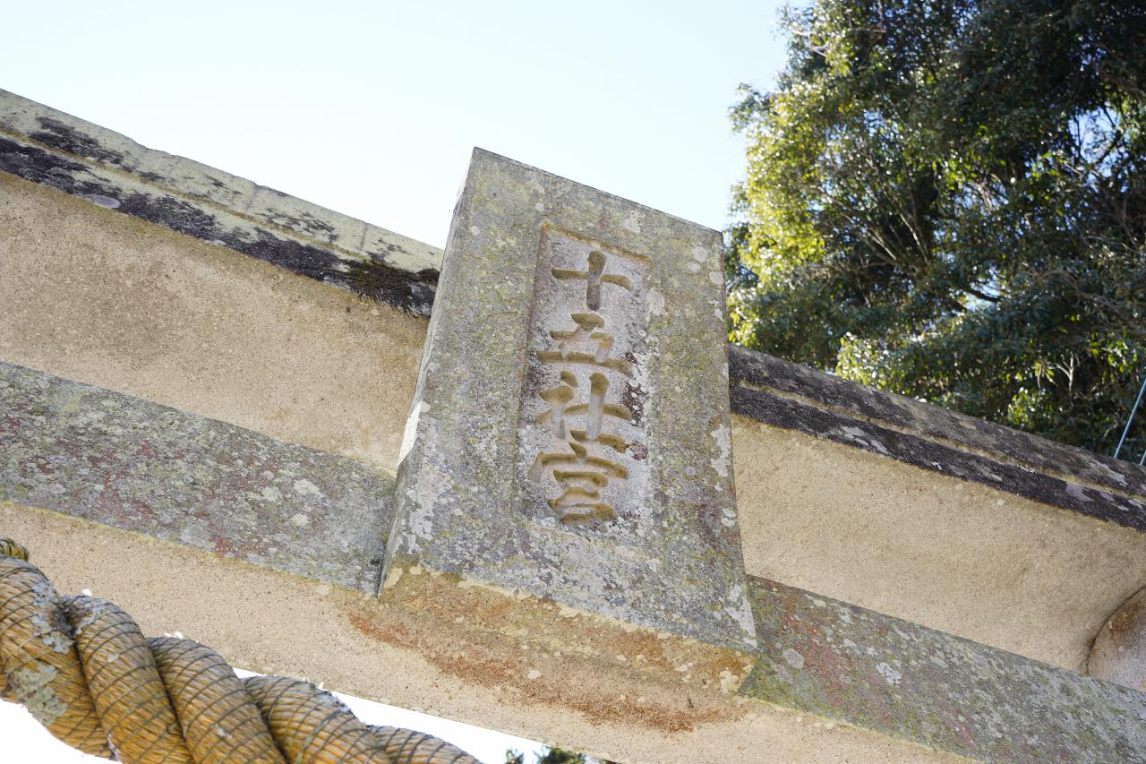 カーブした道を進んでいくと拝殿があります。左右の灯籠などは昭和末期に作られたもののようで、しめ縄も新しくしっかりと管理が行き届いていました。写真中央に見える白い札はキリスト教の言葉が記されていて、天草らしさを感じます。