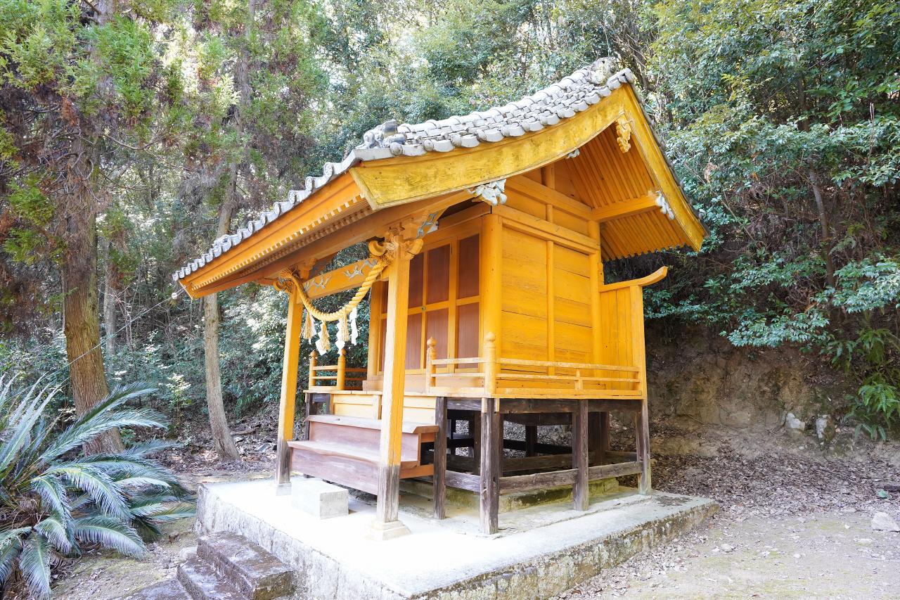 拝殿の裏手、少し階段を上がった先にある本殿。金色で塗られていて神々しさがあります。この十五社宮の近くには漁港を中心に集落が形成されているので、地区の氏神様として大切にされているんでしょうね。