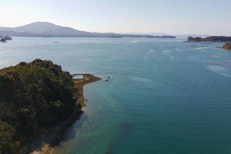 3号橋の天草側手前にある駐車場に車を停めて離陸。少しモヤが掛かっているのが残念ですが、天草の島々と美しいエメラルドグリーンな海面が一望できました。これぞ天草って光景です。