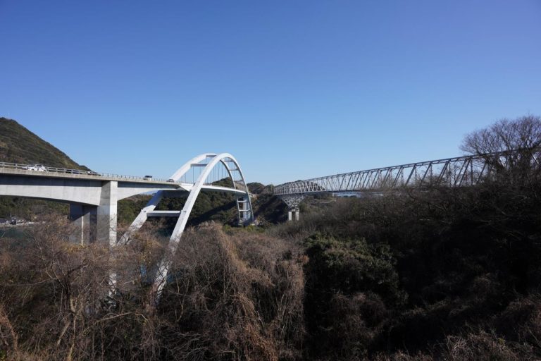 木々より高い場所まで飛ばしてみました。右に見える橋が「1号橋(天門橋)」で、左の橋はバイパスとして2018年に架けられた天城橋。無料の高規格道路となっているので、ナビでは基本的に天城橋を案内されると思います。