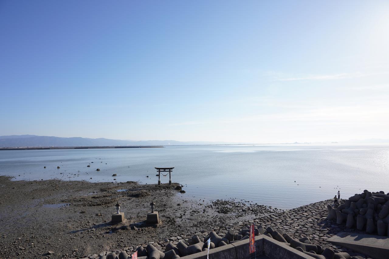 それがこの鳥居。干潮の時には写真のように陸地の上に設置されているように見えるけど、潮が満ちてくると海の中に鳥居があるような光景に。以前来た時には干潮だったからリベンジと思って来たけども、今回も干潮で海中鳥居は見られず……。残念。