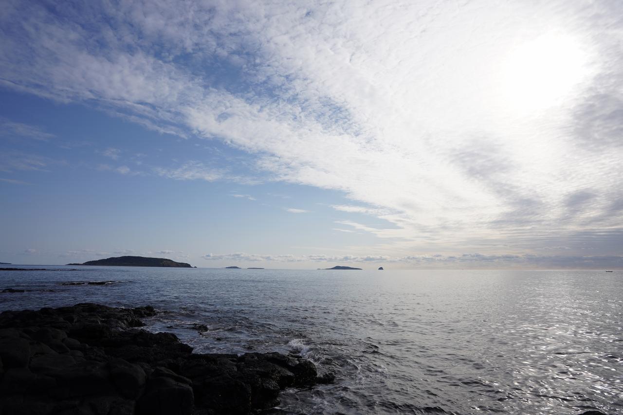 これ以上行くと波で濡れるなって所まで来て撮影。遠くの島と青い空、白い雲といい景色。下手にHDRで叩かないで、ダイナミックレンジで階調を表現するほうが好き。
