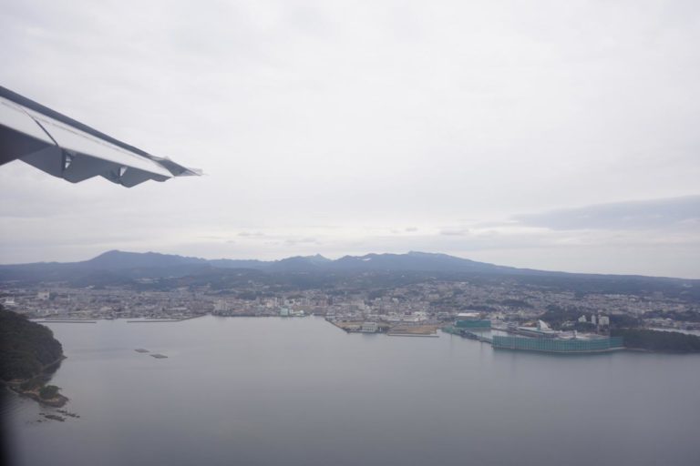 飛び立ってから30分ほどで長崎空港へのアプローチ。シートベルト着用サインが消えている時間のほうが短いほどで、いちいち外すこともないのかなって感じ。どうしてもトイレにいきたいとかなら別だけど。