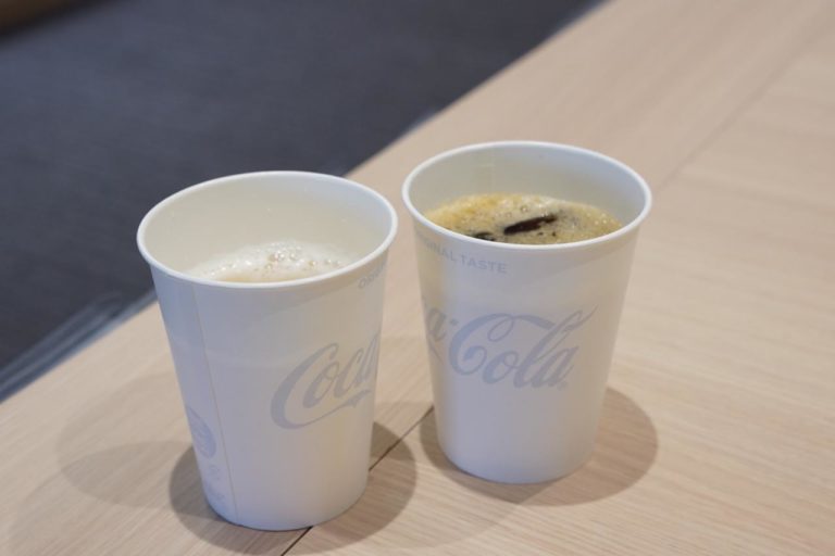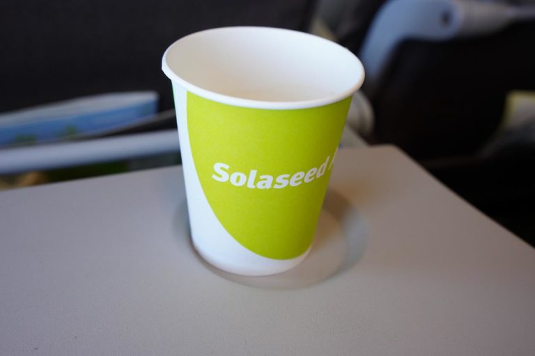 機内ドリンクはソラシドエアオリジナルの「あご柚子スープ」をオーダー。だしが効いておいしいスープで、ホッと暖まります。