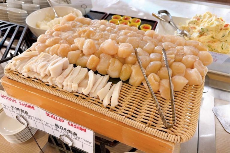 そして山盛り積み上げられているホタテとタコのお刺身! ドーミーインとかでも細かく切られたホタテがあるのは見るけど、まるまる1個のホタテが積み上げられているのはここでしか見たことない。欲のままにホタテをお皿に盛っていきます。
