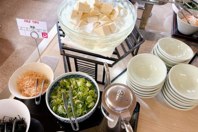 ご飯コーナー。白米のほかにおかゆも用意されています。中央に置いてあるのはカレー。ふと思ったけど帆立のたたきを入れたらホタテカレーになりそう。