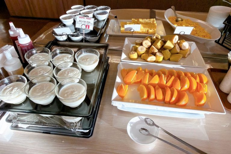 他にも料理はあるけど、先にデザートコーナーを紹介。バナナとオレンジのほか、紋別より少し上にある街「興部」で作られた「おこっぺヨーグルト」が置かれています。濃厚なヨーグルトなので、とりあえずハチミツとか何も掛けずに食べてみてほしい。
