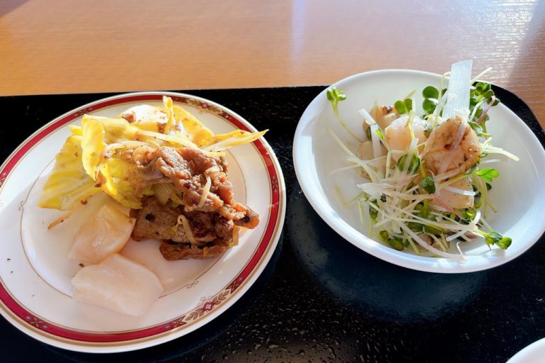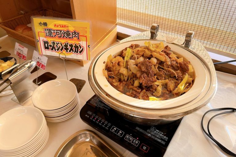 また、パン派の人向けにはロールパンなどの小さ目のパンが用意されています。パンの横にあるのはロースジンギスカン。お肉が結構大きくて食べ応え十分。これもここの朝食の推しメニューです。