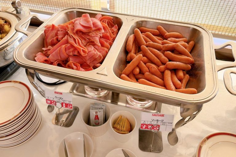 ベーコンにソーセージ。朝食バイキングの定番です。