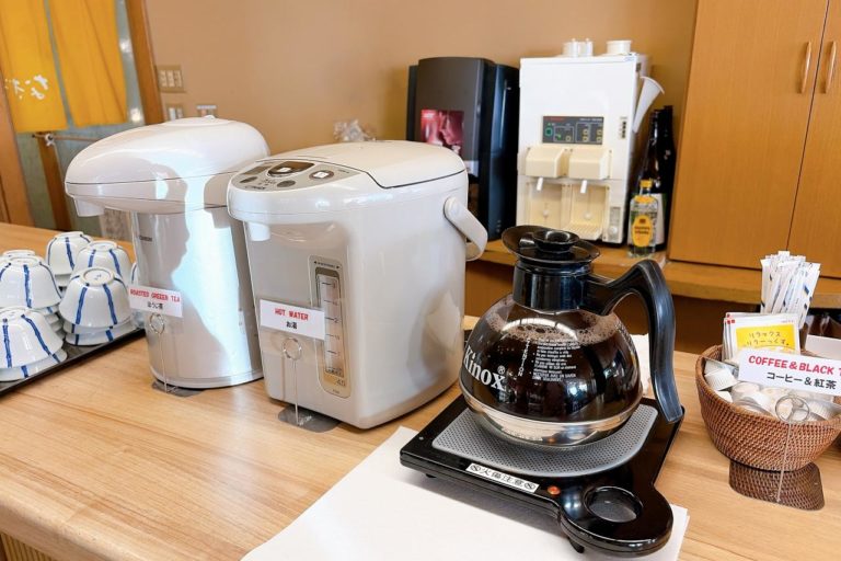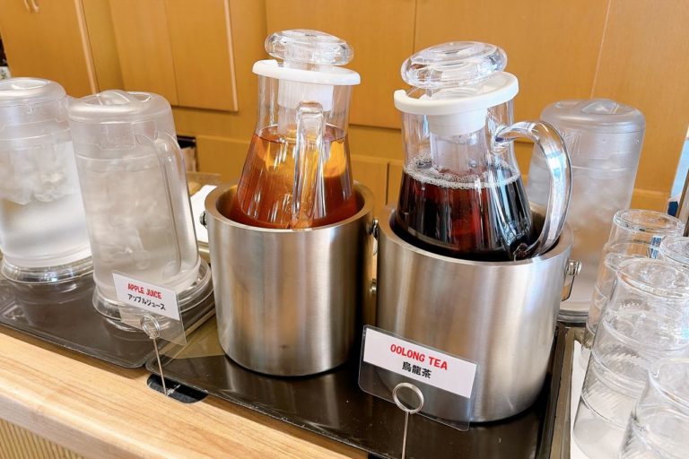 ドリンクコーナーです。まずは客室に持ち帰りもできるコーヒー。その横には烏龍茶とアップルジュースが用意されています。