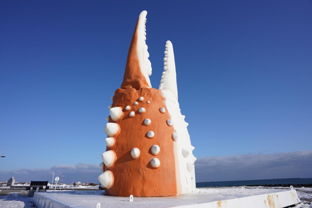 紋別の観光地っていうと思いつくのがカニのオブジェ。海沿いに空に向かってカニのハサミがそびえたつ謎の光景があります。冬の空にめっちゃ映えるんだけど、目の前に来ると何ともシュールな光景な感じも。