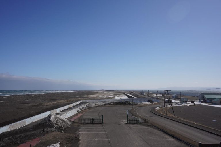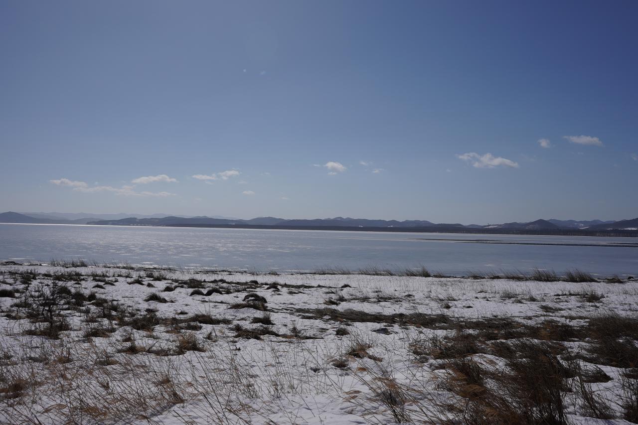 ネイチャーセンターのすぐ横からサロマ湖を撮影。もう少し寒い時期なら湖面上を歩いて渡れるかもしれないけど、今の時期だとどっかで落ちて二度と上がれなくなりそう。今年は例年に比べても気温が高すぎる気がする(2024年は氷点下が基本だった記憶)。