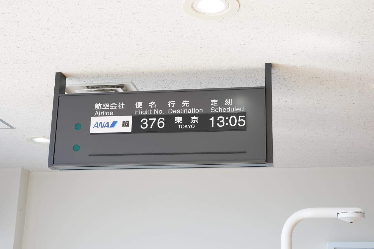 空港内にはお土産店と軽食店がある他は、展望台くらいしかない簡素な施設。保安検査を受けて制限エリアで搭乗時間を待ちます。1日1便しかないので、行き先案内もアナログ式。切り替える必要が無いからね。