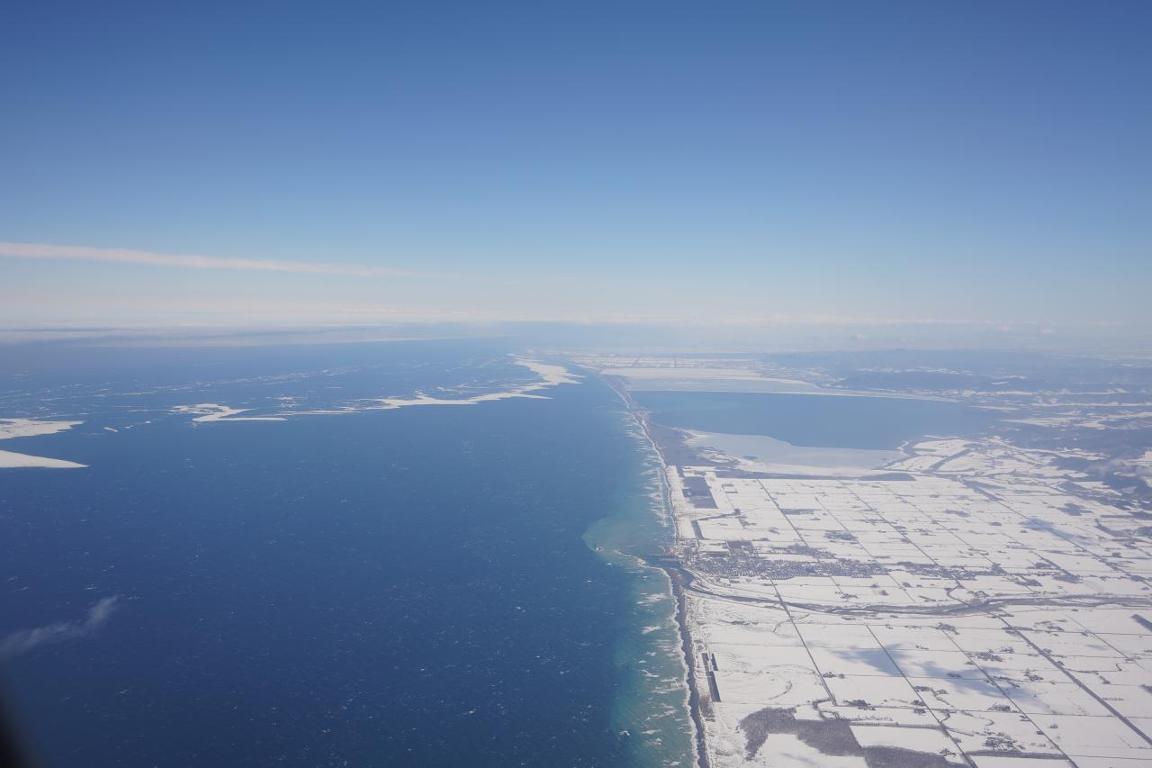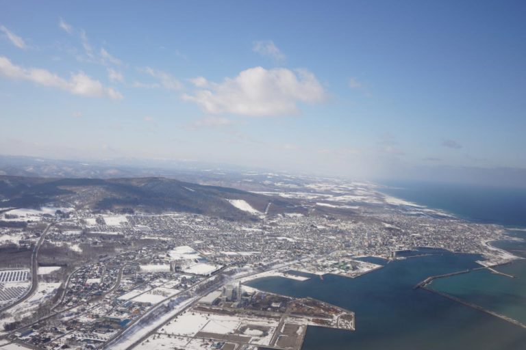 紋別市街地から近い空港なこともあって離陸直後には市街地が一望できます。この景色が見られるのもオホーツク紋別空港の魅力のひとつ。