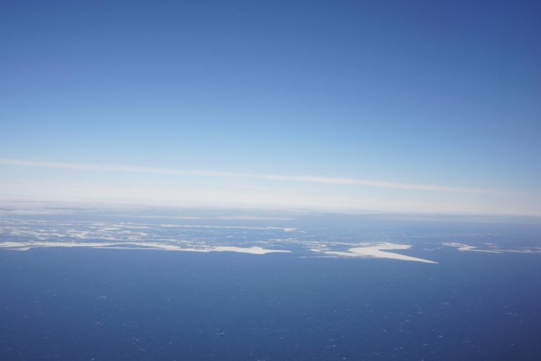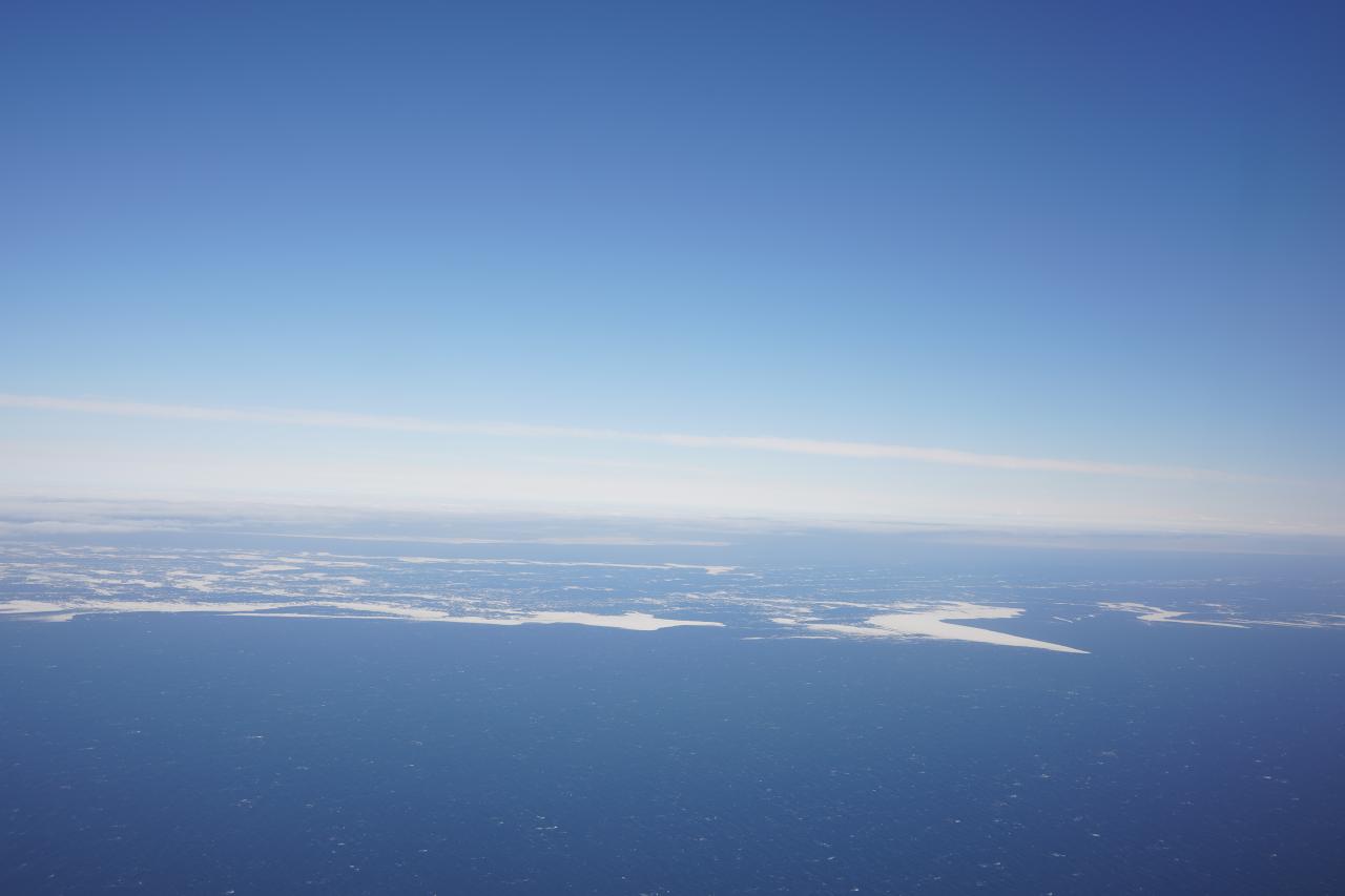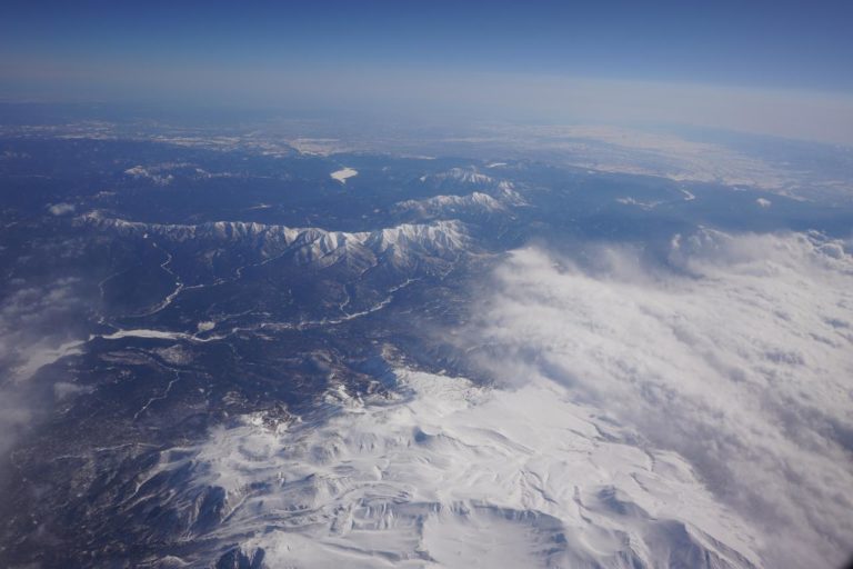 しばらく飛行して、ふと外を見ると大きな山々。地図で場所を確認すると大雪山領空だったようです。天然水がおいしいことでも知られる大雪山、やっぱり冬の時期が映えるよね。