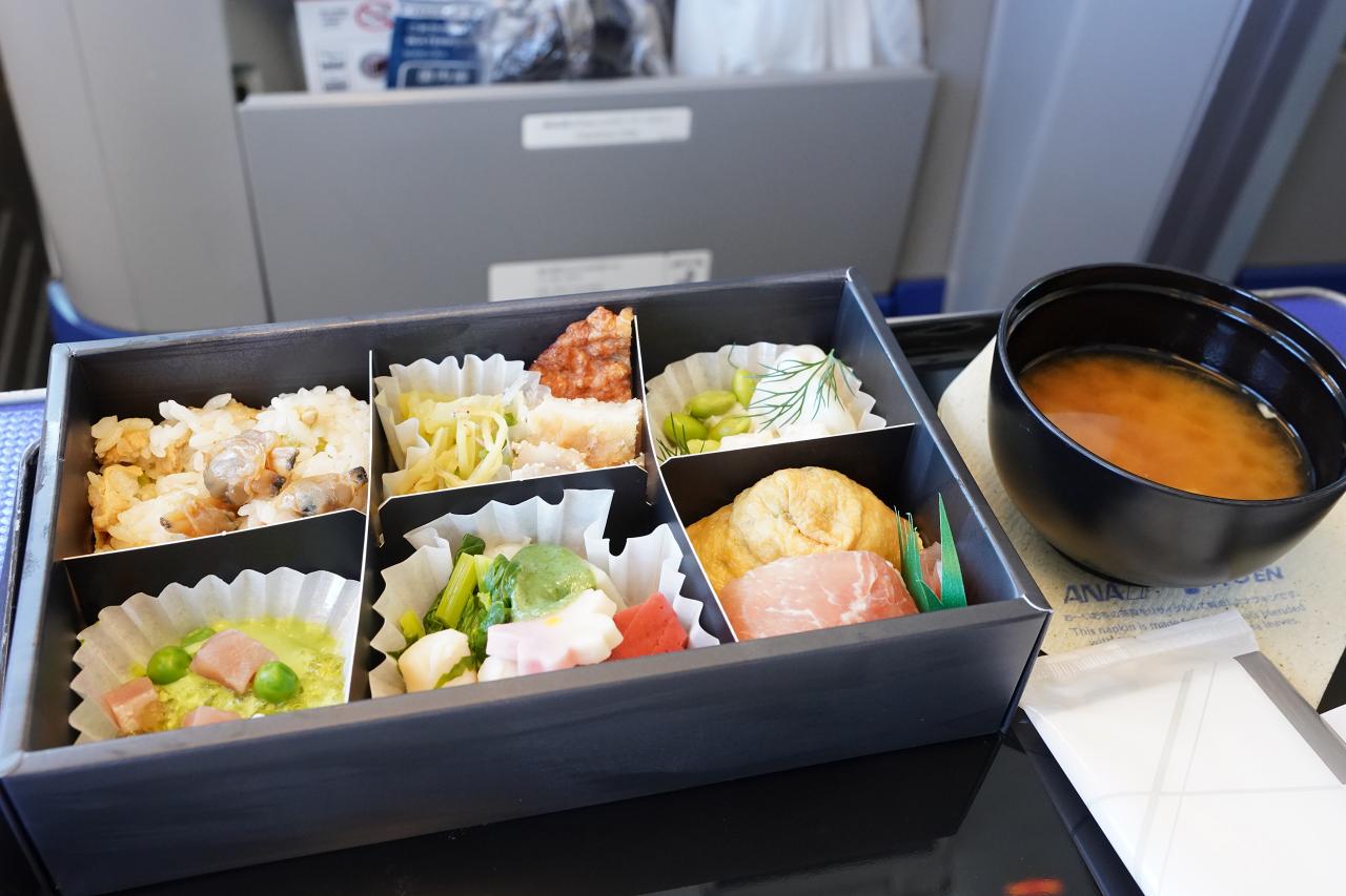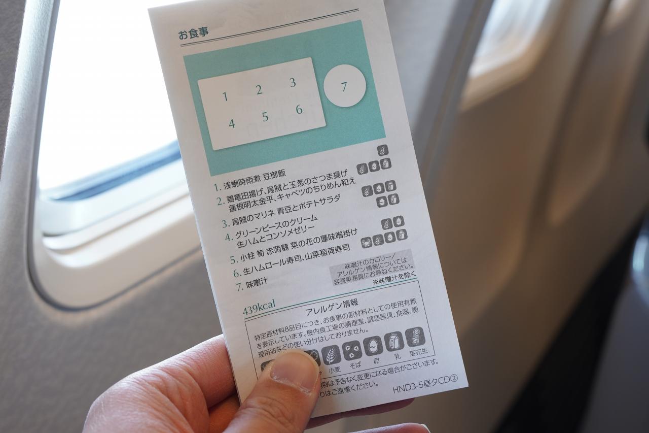 シートベルト着用サインが消えて機内食が運ばれてきました。豆ごはんや竜田揚げ、煮物などが詰め合わせになったお弁当で、温かいお味噌汁も付いてきました。約500Kcalほどだけど、栄養バランスも考えられていておいしい。普通に空弁としても売ってくれないかなって思ったりもする。