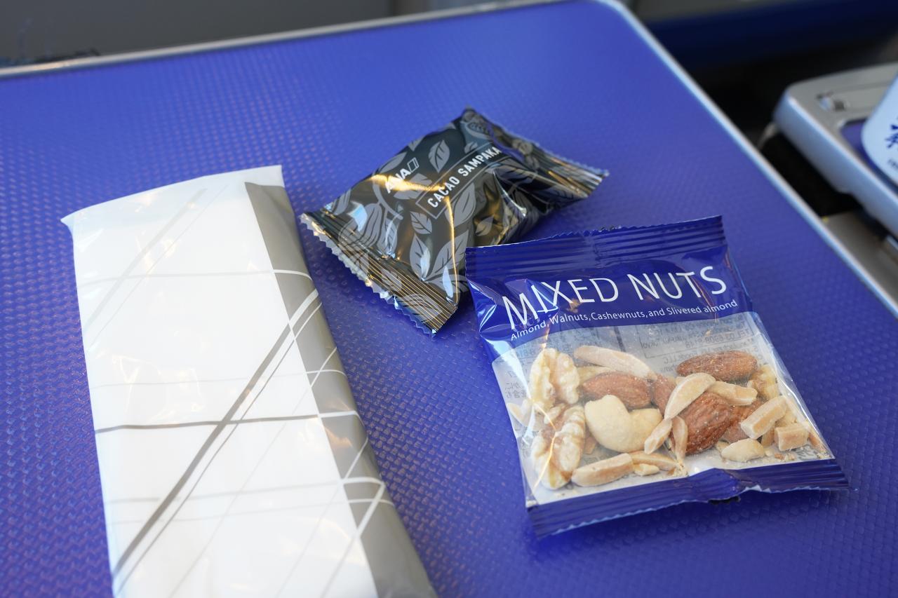食後にミックスナッツなどのお菓子をもらってコーヒーと一緒にいただきます。プレミアムクラスて至れり尽くせりな感じでやっぱりいいね。特別な時とかにはぜひ乗ってみてほしい。