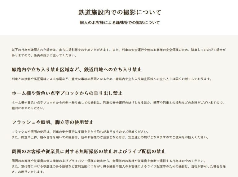 阪急電鉄が掲載した「鉄道施設内での撮影について」のリリース。いったいどのようなものが対象になるのかを確認したら事実上の「X」や「YouTube」禁止令ではって状況に。旅行などのレポにも一切使えなくなりそう。