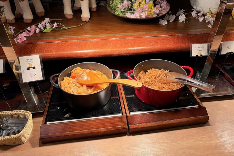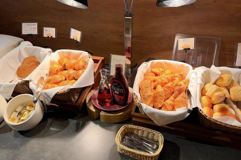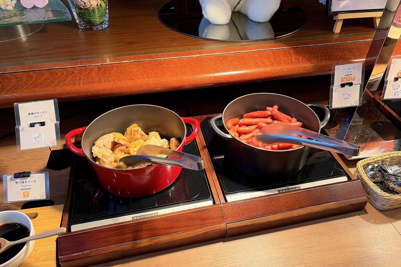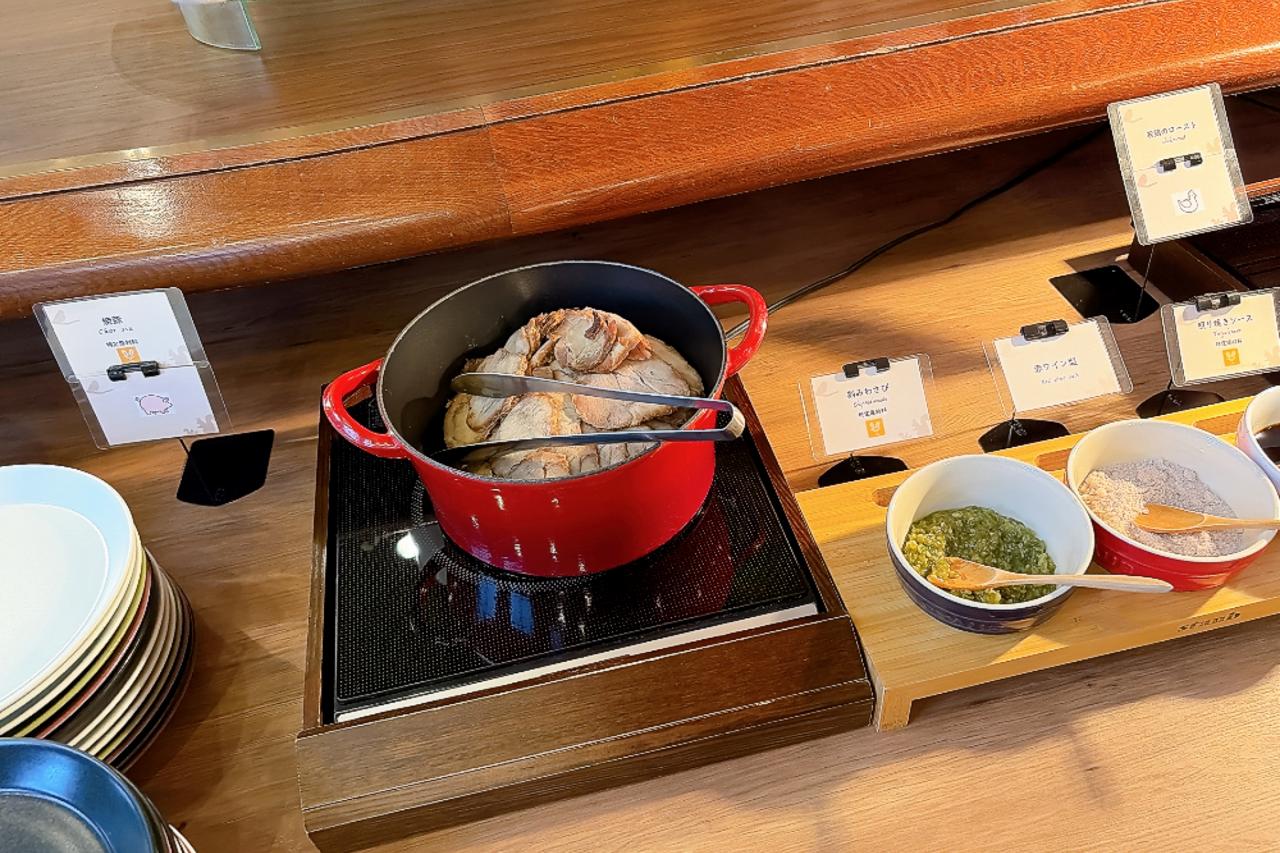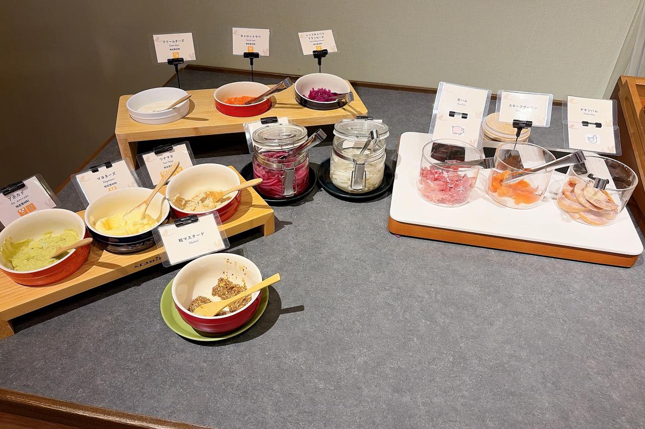 朝起きて朝食へ。早速朝食メニューの紹介です。まずは焼豚と鶏肉のロースト、さらにウインナーとお肉メニューがあれこれ。付け合わせに刻みわさびに赤ワイン塩などが用意されていました。