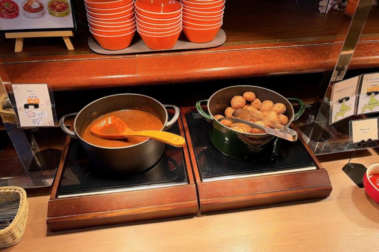 カレーと揚げポテト。カレーには並んでいたお肉やじゃがいもなどを入れてオリジナルカレーを作って食べられるようです。