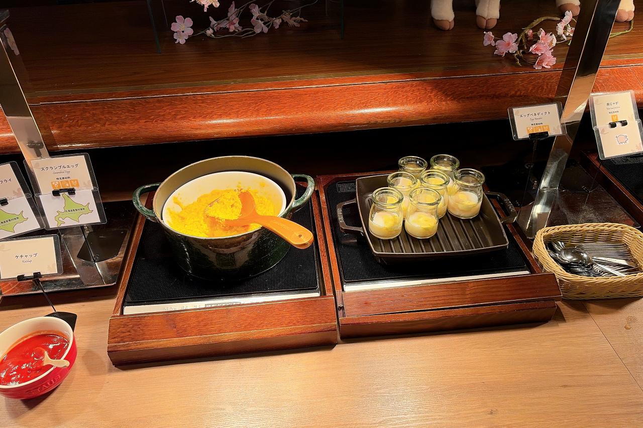 スクランブルエッグとエッグベネディクト。ガラス容器に半熟卵が入ってるみたい。