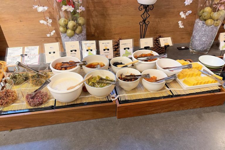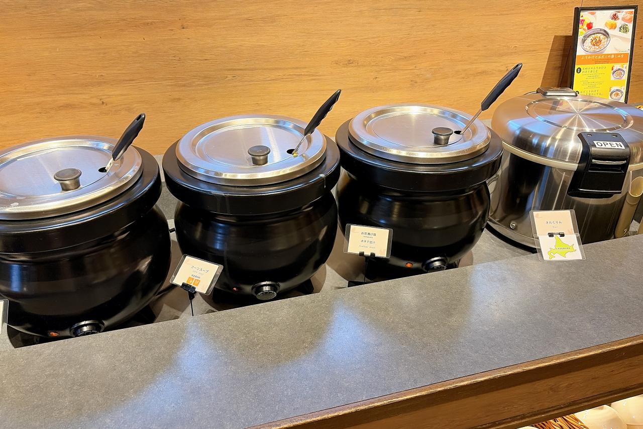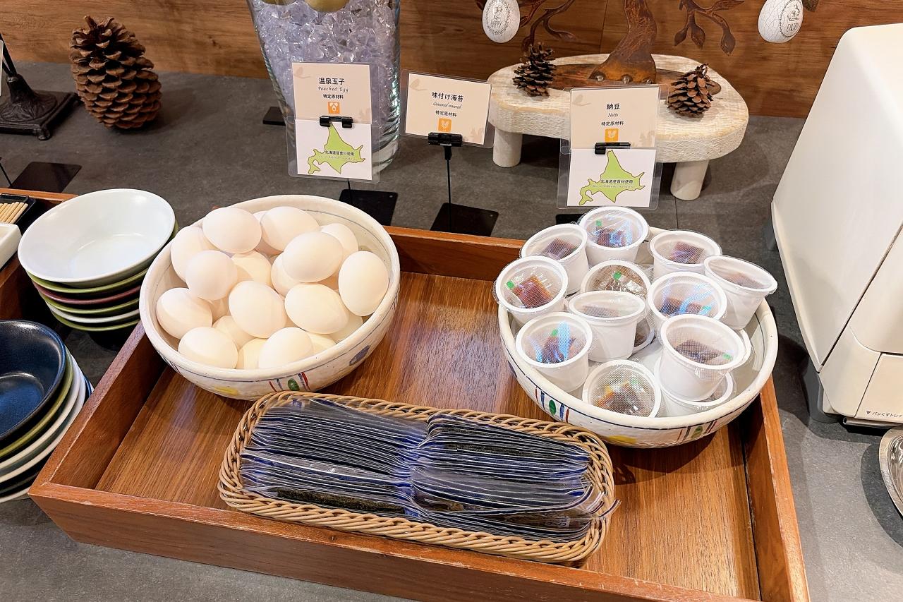 厚焼き玉子やトロロ、ザーサイなどの総菜とお茶漬けコーナー。ふりかけやご飯のお供を乗せて、ホタテだしを掛けて食べるお茶漬けが楽しめます。