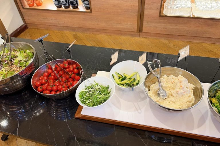 持ってきたバイキングメニュー。品数的には多すぎず少なすぎずでバランスよくいろいろな物が食べられて満足。そしてスモークサーモンは好きなのでそのままパクパク食べちゃいました。買うと意外と高いんだよね……。ごちそうさまでした!