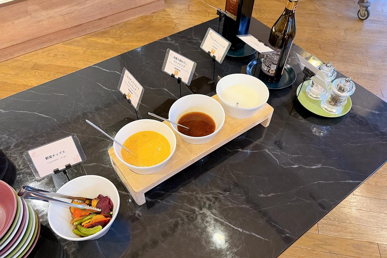 生野菜のサラダコーナー。ミックスサラダにトマト、ポテトサラダにブロッコリーなどが並びます。ドレッシングには大根おろしやフレンチドレッシングがありました。