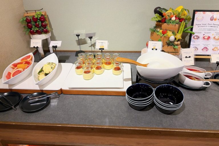 デザートにはグレープフルーツやパイナップルの他、自家製のプリンにヨーグルト。ヨーグルトにはいちごやブルーベリーのソースをつけて食べられます。