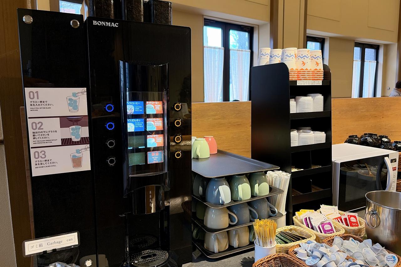 ドリンク。お茶や炭酸水のほか、お酢の「美酢」や牛乳、北海道名物のソフトカツゲンや各種野菜ジュースなどがありました。また、部屋に持って帰れるコーヒーも。