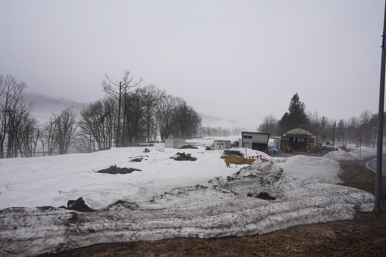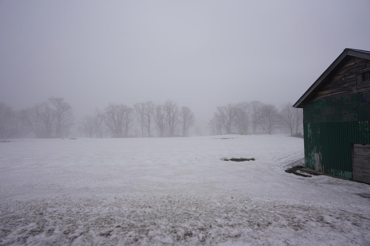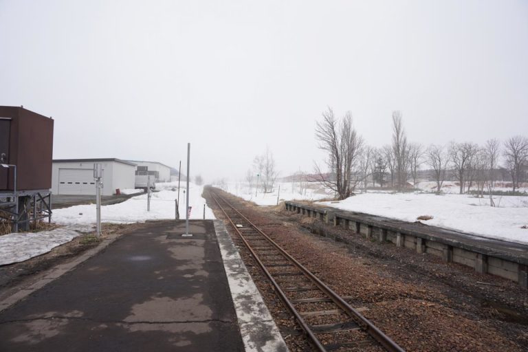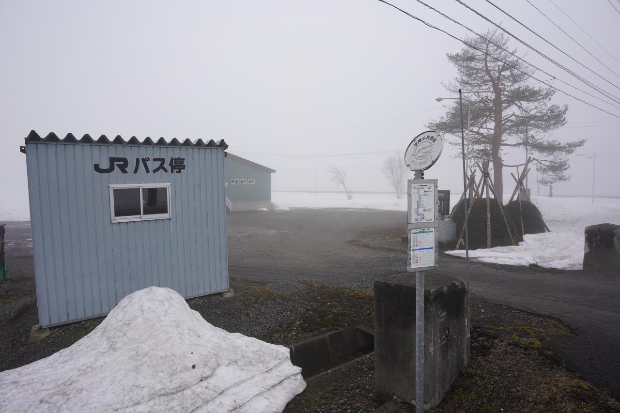 かなり霧が濃くなっているけども、現地は道幅が拡張されて線路の痕跡も何も残されていませんでした。雪が積もってる辺りにホームがあったようです。
