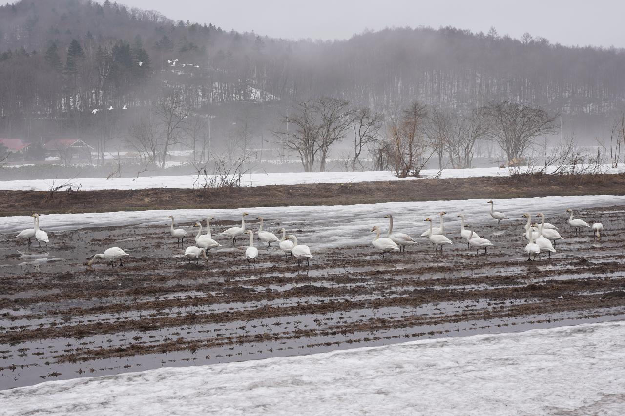 多度志駅から次の駅へと向かっている途中、畑のような場所にたくさんの白鳥がたむろしていました。他の場所でもこのように集まっている光景が見られ、今の時期に過ごす場所みたいね。