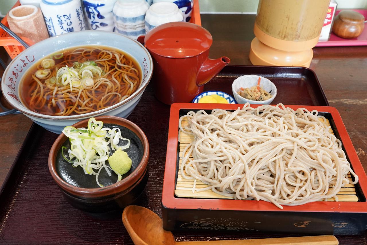 しばらく待っているとお盆にいっぱいのそばが到着。まずは冷たいそばからいただいてみると、しっかりとしたコシとのどごし。ここのそばは二八そばのようで、そばの香りも存分に楽しめました。続いて温かいそばは、冷そばに比べるとコシは弱め。そば自体はおいしいけども、冷そばのほうが自分は好みかも。最後は冷そばのつゆにそば湯を入れて完食。ごちそうさまでした!