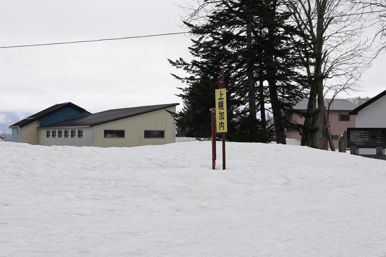 訪れた際には三角形の道の斜辺となる道は除雪されておらず雪の中。駅跡も雪に埋もれていましたが、接近標識の「上幌加内」だけが飛び出ていました。これが無かったら気づかなかったかも。