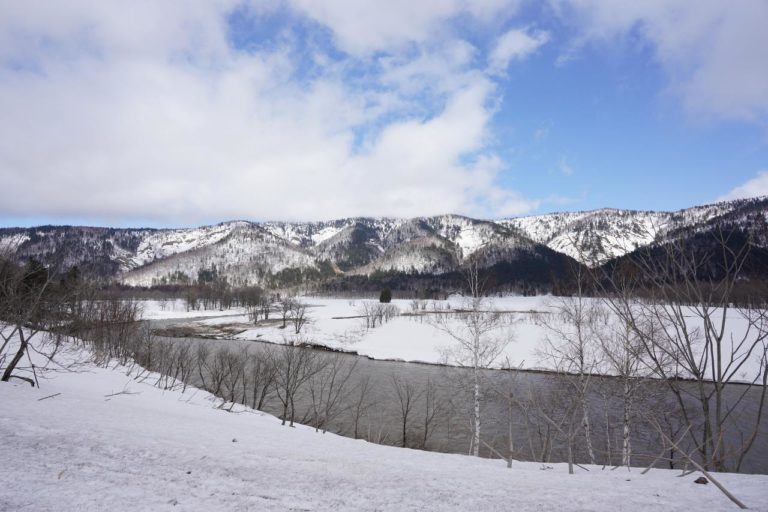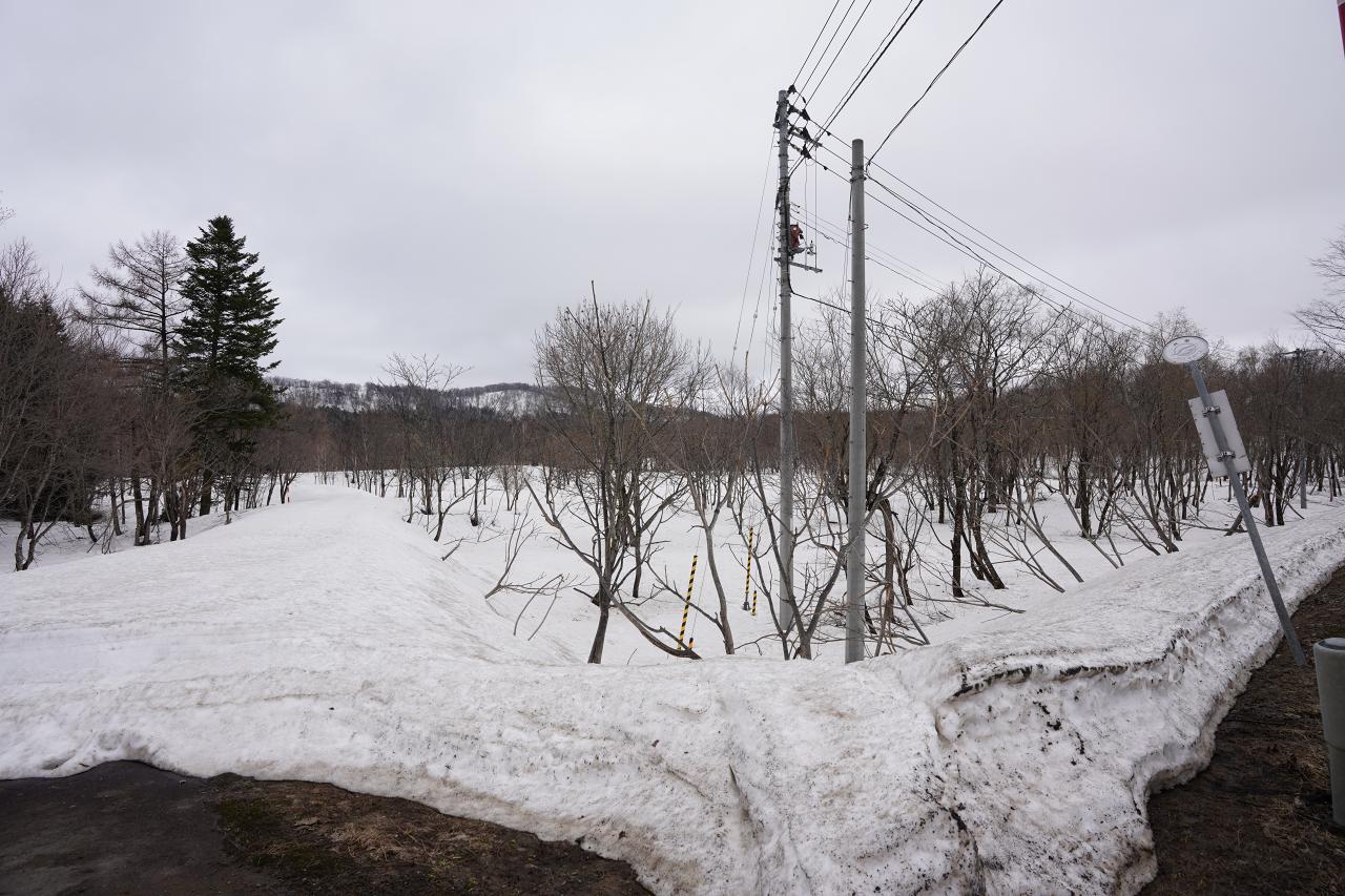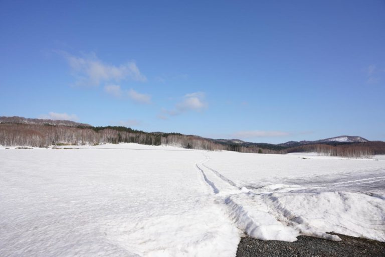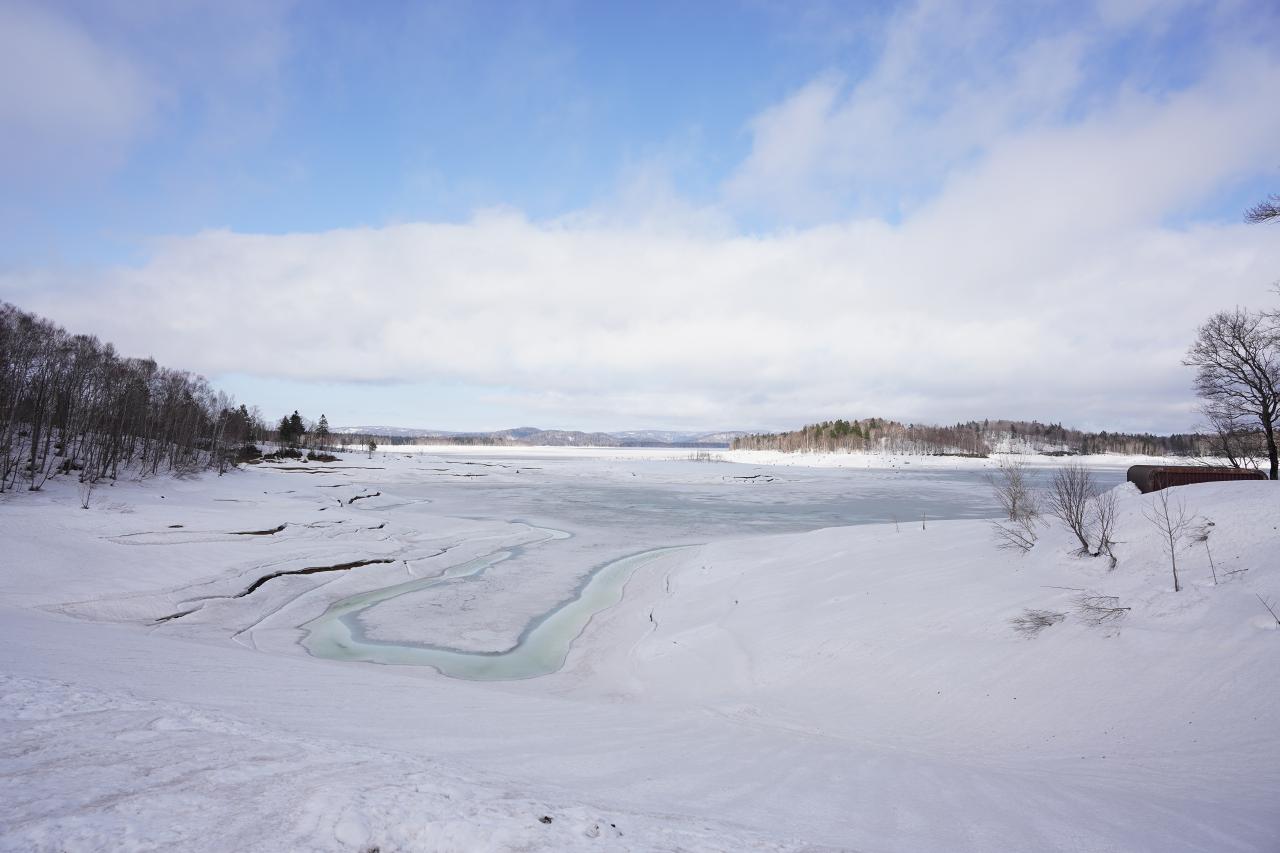 展望台からの景色。朱鞠内湖は冬シーズンにワカサギ釣りができるようで、4月5日の段階でも湖面が凍っていて歩けそうな状態になっていました。しかしワカサギ釣りは3月末で終わっているようで、危険なので湖面には立ち入らないようにとの記載。落ちたら生きて帰れ無さそうだし、無茶をするのはやめておこう。