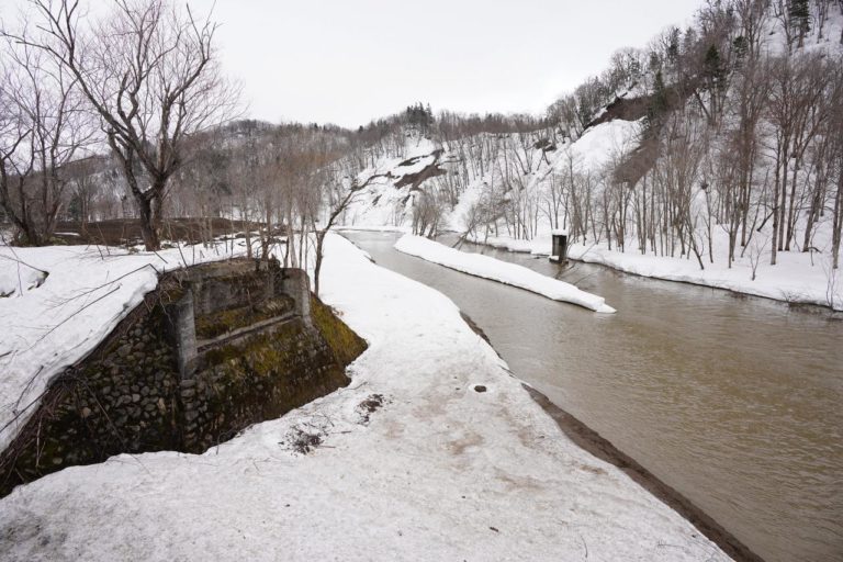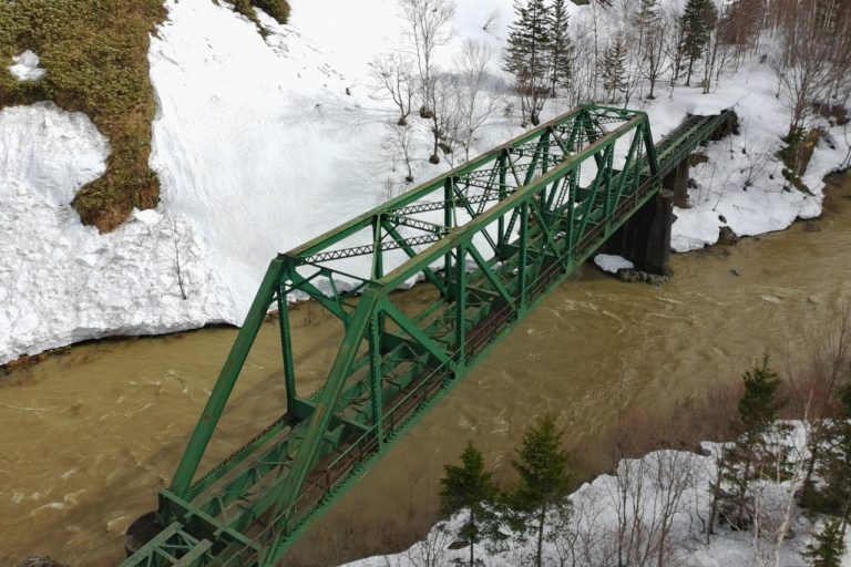 国道275号線から分岐する道の手前に残されている第三雨竜川橋梁。周囲から撮ると木々が邪魔してしまったので、ドローンを飛ばして上空から撮影。雨竜川が雪解け水で濁ってしまっていますが、車窓からは雨竜川の景色を楽しめたんじゃないかなと思います。