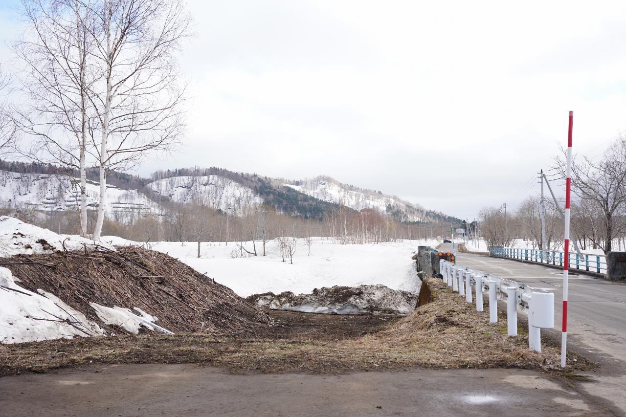 先ほどの共栄駅から少し進んだ雨竜川を渡る「深雪(みゆき)橋」を渡ると、何やら跡を発見。最初は手前が深名線なのかなと思ったのですが、こちらは旧道のようで奥にポツンと立つ橋脚が深名線の廃線跡のようです。